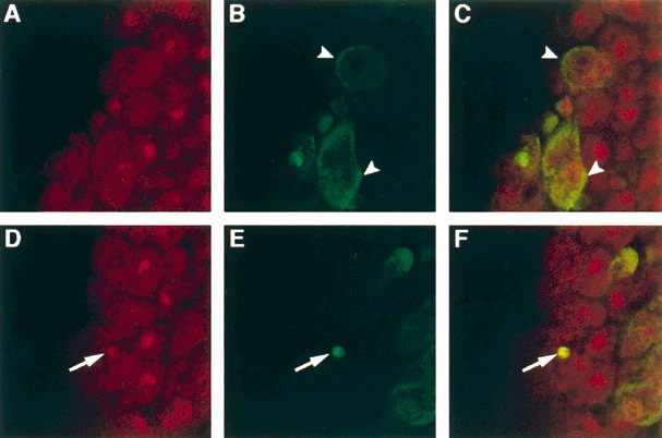 Figure 5. Smad6 protein accumulates at the plasma membrane and in the nuclei of overexpressing cells. Embryos were injected at the two-cell stage with 200 pg of plasmid pCS2+Smad6-myc, fixed at stage 12 and immunostained with antimyc antibody (9E10) which was visualized using a fluoroscein-conjugated anti-mouse secondary antibody (green; B,E) followed by nuclear staining with propidium iodide (red; A,D). Overlap of nuclear and antimyc expression appears light green (C,F).