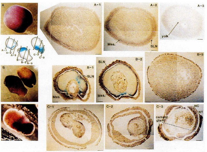 Fig. 8. X-twi expression in dorsalized and ventralized embryos. (A and B) Whole-mounts of UV ventralized embryos at equivalent stages 23/24 (A) and 32/33 (B) respectively. (C) Whole-mount of a LiCI dorsalized embryo at equivalent stage 29/30. In all cases, X-twi transcripts are restricted to one pole of the embryo. (A-1 to C-3) Transverse sections through ventralized and dorsalized embryos show that X-twi transcripts are in the cell layers that could be equivalent to the SLN and the facing mesodermal layer of normally developing embryos. Sections A-1 to A-3 correspond to embryo A, sections B-1 to B-3 to embryo B. and sections C-l to C-3 to embryo C. On drawings, the plan of different sections are presented. Mes., mesodermal cells; NC, neural crest cells; NT. neural tube; SLN. sensorial layer of the neurectoderm. Bar, 100 mm. |