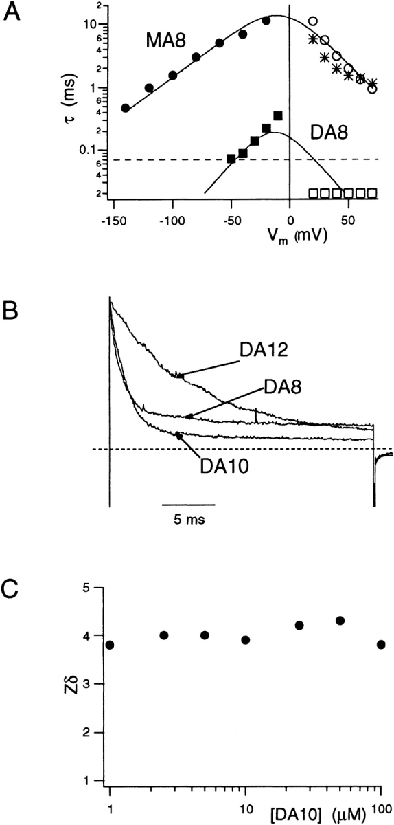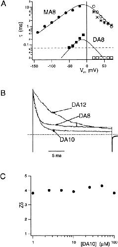 Figure 9. (A) Diamine block and unblock kinetics are much faster than monoamine kinetics. Time constants (τ) of block and unblock by 100 mM MA8 and DA8 obtained from experiments shown in Figs. 3, 6, 7, and 10. Plotted versus voltage. The line fitted to the MA8 data corresponds to a single site-blocking model with kon,0mV = 5 × 10−4 ms−1 · μM−1 and koff,0mV = 0.03 ms−1, Zon = 2.2, Zoff = 1.6. The line corresponding to DA8 is the same model with kon and koff 100× faster. The horizontal dashed line indicates the approximate limits of resolution for these experiments, so that block kinetics for 100 μM DA8 were too rapid to measure (plotted below the line). Asterisks indicate τ for block by 1 μM DA8 (see text). (B) Representative current traces show that increasing the alkyl chain length slows channel block. Traces show block by 1 μM DA8, DA10, and DA12 at 50 mV after a prepulse to −80 mV. The capacitance transient has been digitally subtracted from the depolarizing pulses, and all traces have been scaled to the amplitude of current at −80 mV. Dashed line indicates zero current level. (C) The valence of diamine block is independent of blocker concentration. Effective valence of block (Z) by DA10 as a function of blocker concentration, obtained from a single patch subjected to a voltage protocol like that shown in Fig. 7. |