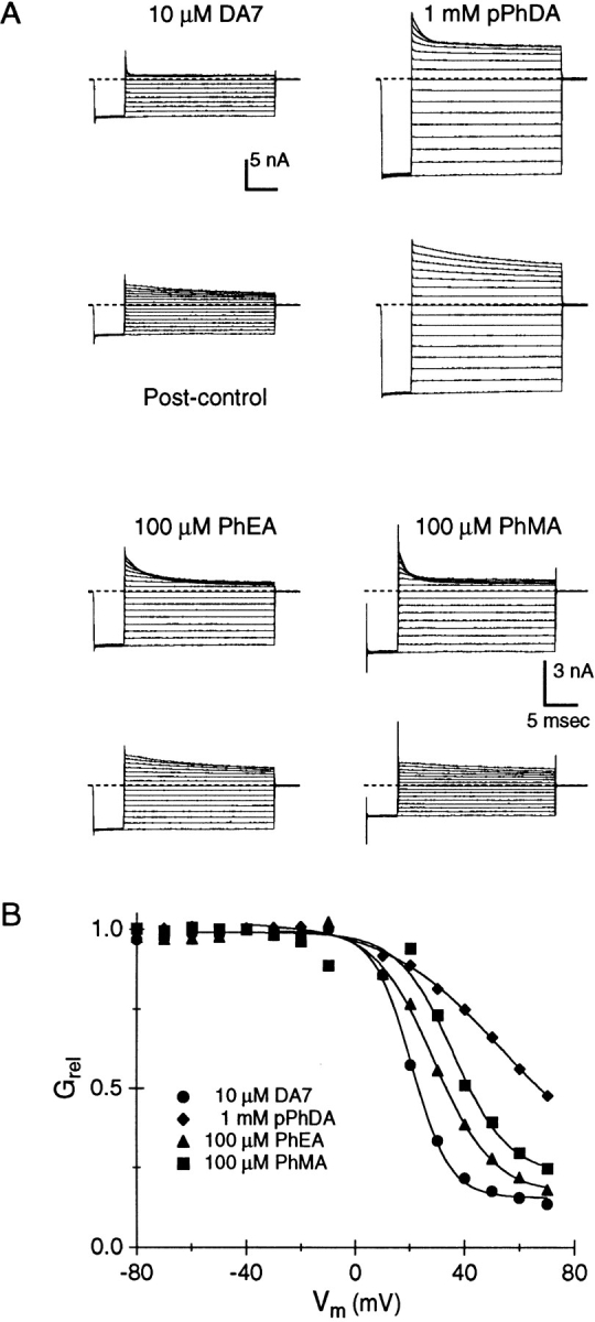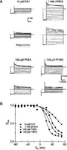 Figure 11. Block by phenyl amines is considerably weaker than block by alkylamines. (A) Kir2.1 currents recorded from an inside-out membrane patch in response to voltage steps to voltages between −80 and +70 mV after a prepulse to −80 mV from a holding potential of 0 mV. Currents are shown in the presence of 10 μM DA7, 100 μM PhMA, 100 μM PhEA, or 1 mM pPhDA. In each case, the post-control currents were obtained after washing out the test solution. Scale bars: 5 nA for pPhDA, PhEA, and DA7, 2 nA for PhMA, and 5 ms. (B) Steady state GRelative–voltage relationships for the currents shown in A. The continuous lines are fits to the Boltzmann equation (see text). |