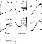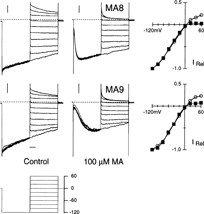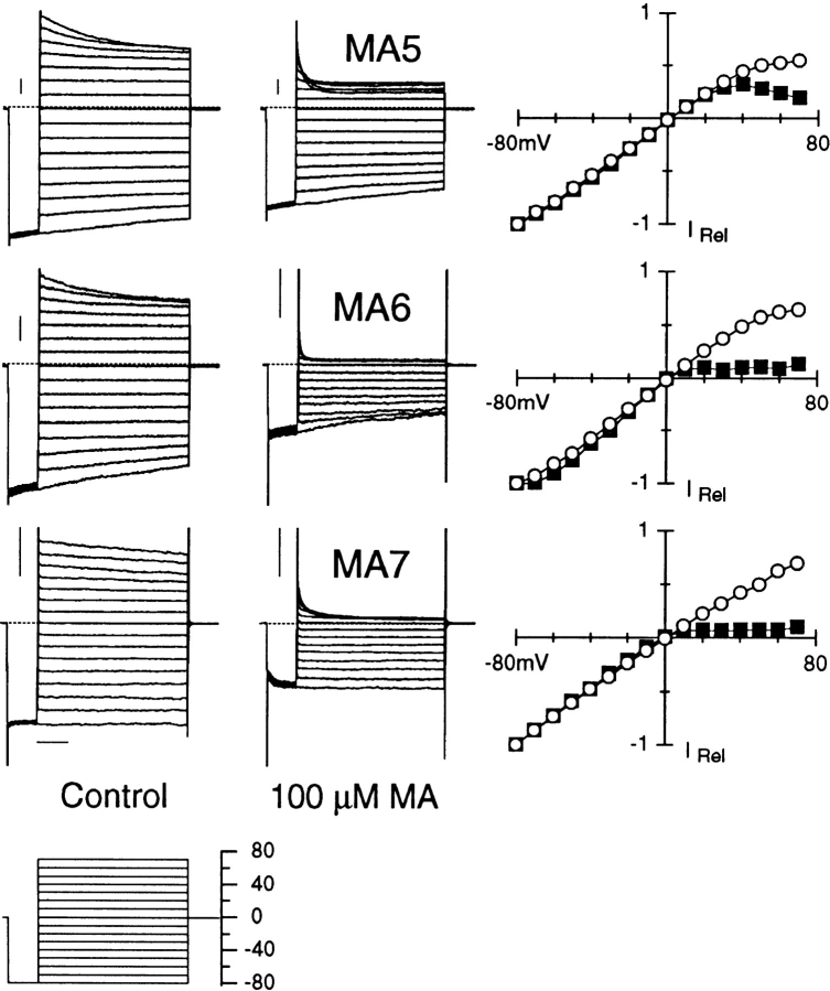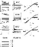 Figure 2. Monoamino alkanes cause weak inward rectification of Kir2.1 currents. (left) Kir2.1 currents recorded from an inside-out membrane patch in response to steps to voltages between −80 and +70 mV after a prepulse to −80 mV from a holding potential of 0 mV as indicated. In each case, the control recordings were obtained after removal of rectification after patch excision, and the patch was then exposed to 100 μM monoamines as indicated. Scale bars: 2 nA and 5 ms. (right) Steady state current–voltage relationships plotted from the above current traces. |