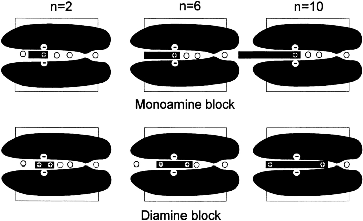 Figure 12. Accommodation of polyamines within the pore of Kir channels. Kir pores are hypothesized to have a long (>20 Å) inner vestibule with strong electronegativity provided by the ring of negative charges at the “rectification controller” position (D172). While more peripheral negative charges (e.g., E224) may provide additional peripheral amine binding sites, a single diamine (bottom) can occupy the deep pore, the two amines being equidistant from the center of the ring of negativity at the rectification controller. As alkyl chain length increases, the head amine is pushed deeper into the pore, displacing K+ ions to the outside of the cell. Monoamines (top) can also occupy the pore, but the head amine remains in the ring of electronegativity provided by the rectification controller, the alkyl chain stretching back out of the pore. |