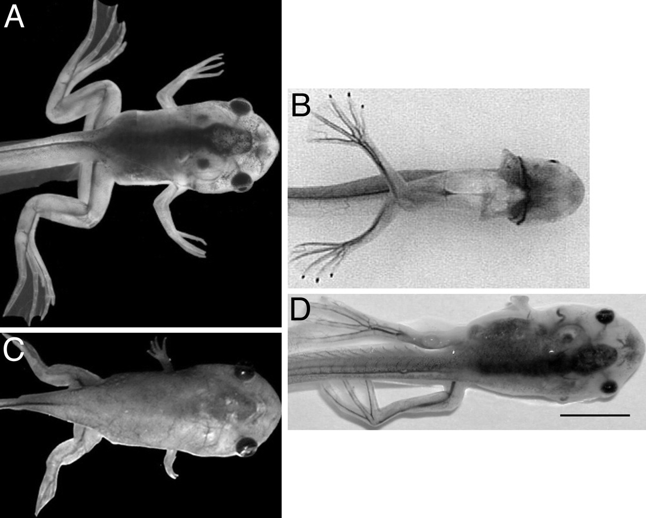 Fig. 3. Transgenic NF 63 tadpoles at the climax of metamorphosis showing the typical limb phenotypes that occur when these three promoters drive a TRDN transgene. (A) Wild type. (B) Constitutive NβT/TRDN paralyzed phenotype (ventral view). (C) Constitutive collagen/TRDN âpigâ phenotype. (D) Inducible pCar/TRDN paralyzed phenotype. This F1 progeny was induced with 50 μg/ml doxycycline from NF 52 to NF 63. (Scale bar: 2 mm.)