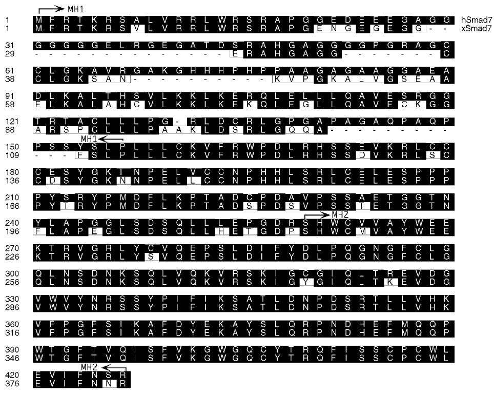FIG. 1. Structure of Xenopus Smad7. Alignment of the predicted amino acid sequences of human Smad7 and Xenopus Smad7. Identical