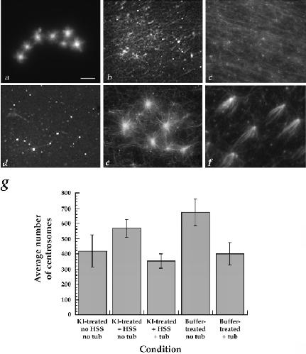 Figure 2. Examples of complementation of KI-treated centrosomes. The complementation assay was carried out as outlined in Fig. 1 and Materials and Methods. (a) Microtubule asters regrew on buffer-treated centrosomes that were incubated with rhodamine-labeled tubulin at 30°C. (b and c) Microtubules, but no asters, formed when a 228,000 g supernatant from a 0–2 h embryo extract was incubated at 30°C (b) or 0°C (c) on coverslips in the absence of centrosomes, followed by a 30°C incubation with rhodamine-tubulin. (d) When KI-treated centrosomes were incubated with buffer instead of extract, followed by rhodamine-tubulin, few microtubules and no asters formed. (e and f) Asters formed when KI-treated centrosomes were first incubated with extract at 30°C (e) or 0°C (f) and then with rhodamine-tubulin at 30°C. (g) KI- and buffer-treated centrosomes bind consistently to coverslips. The number of centrosomes bound to coverslips under the typical experimental conditions used throughout this study was determined by counting structures that were stained with antibodies against α- and/or γ-tubulin. The average number counted in 50 and 100× microscope fields is shown. Three to five separate experiments were counted for each condition. Bar, 10 μm.