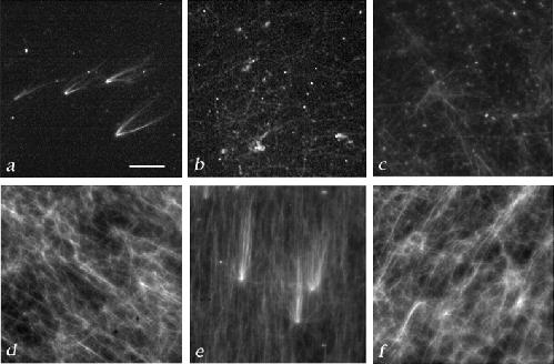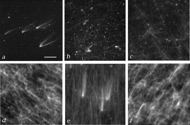 Figure 8. The γTuRC is necessary, but not sufficient for complementation of salt-stripped centrosomes. Complementation tests were carried out as described in Fig. 1 and Materials and Methods. (a) Asters formed when KI-treated centrosomes were incubated with the partially purified large γ-tubulin complex from a Superose-6 column followed by rhodamine-tubulin. (b) Some free microtubules, but no asters formed when the same fraction was incubated without KI-treated centrosomes. (c) KI-treated centrosomes were not complemented by γ-tubulin–depleted extract. (4 asters were counted in 50 100× microscope fields). (d)KI-treated centrosomes were not complemented by immunoaffinity-purified γTuRC, although microtubules could form (6 asters/50 microscope fields). (e) Asters formed after incubation of KI-treated centrosomes with a 1:1 mixture of immunoaffinity-purified γTuRC and γ-tubulin–depleted extract (151 asters/50 fields). (Other ratios of extract to γTuRC were tested; although some activity is still detectable at a 20:1 ratio of extract to γTuRC (data not shown). (f) Microtubules, but no asters formed when a 1:1 mixture of immunoaffinity-purified γTuRC and γ-tubulin–depleted extract were incubated in the absence of centrosomes. Bar, 10 μm.