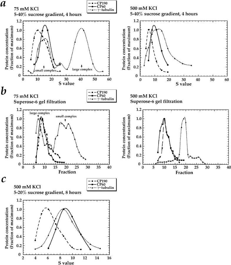 Figure 6. A graphical representation of the sucrose gradient (a)and gel filtration data (b and c) in Fig. 5. The γ-tubulin is present in two distinct complexes; CP190 and CP60 are not components of either complex. For each fraction, standard curves were used to determine the corresponding S value and the relative concentrations of CP190, CP60, and γ-tubulin (see Materials and Methods).