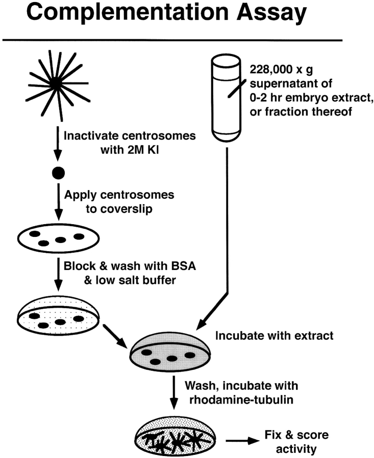 Figure 1. Complementation assay. Centrosomes isolated from Drosophila embryos are inactivated by incubation with 2 M KI. The KI-treated centrosomes are allowed to bind to a glass coverslip. The coverslip is washed and blocked with a low-salt, BSA-containing buffer, and then incubated with the extract or fraction to be tested. The extract/fraction is washed away and the coverslip is incubated with rhodamine-labeled tubulin. Any resulting asters are fixed sequentially with glutaraldehyde and methanol. The number of asters per 50 microscope fields (100× objective) is determined by counting samples while viewing through a fluorescence microscope. See Materials and Methods for details.