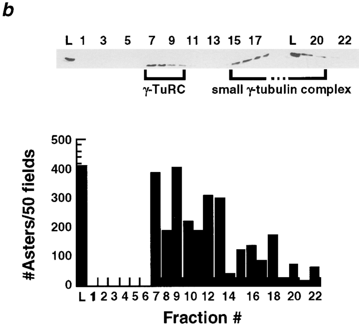 Figure 7. (a) The γTuRC partially purified on a 5–40% sucrose gradient complements KI-treated centrosomes. The small γ-tubulin complex does not. 100 μl of the extract that complements KI-treated centrosomes was loaded on a 5-ml 5–40% gradient made in column buffer + 100 mM KCl. See Materials and Methods for details on running and fractionating gradients. Top, immunoblot showing that two γ-tubulin–containing complexes can be separated on a 5–40% sucrose gradient. Bottom, sucrose gradient fractions were tested (Fig. 1) for their ability to complement KI-treated centrosomes and the number of asters that formed in 50 microscope fields was counted. Fractions 11–14, which contain the γTuRC were able to complement KI-treated centrosomes. (b) The γTuRC partially purified by FPLC on a Superose-6 gel-filtration column run in Column buffer + 100 mM KCl complements KI-treated centrosomes. Top, immunoblot showing that two γ-tubulin–containing complexes can be separated by gel filtration. The γTuRC elutes just after the void volume. 50 μl of the extract that complements KI-treated centrosomes was loaded on a 24 ml Superose-6 column. 0.5-ml fractions were collected. The column load (L) and fractions 1–22 are shown. Bottom, column fractions were tested for their ability to complement KI-treated centrosomes (Fig. 1). Fractions containing the γTuRC were able to complement.