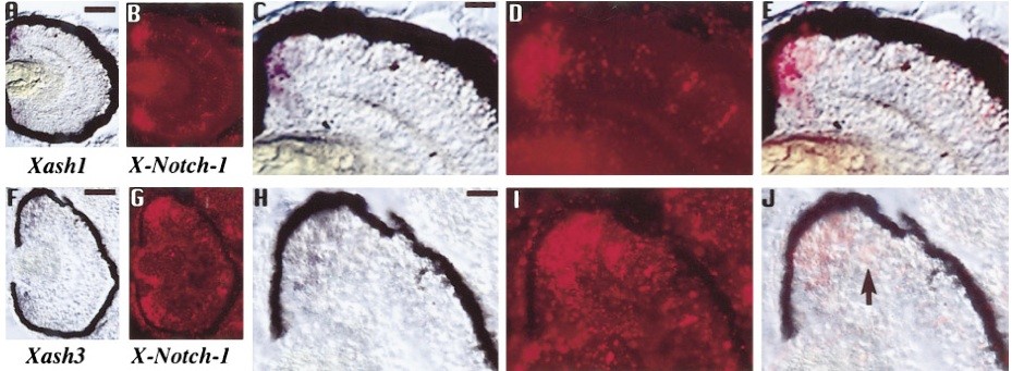 FIG. 2. Comparison of X-Notch-1 and achaete-scute-like gene expression patterns in stage 40 Xenopus retina. (A) Comparison of X-Notch-1 and Xash1 expression patterns. Double in situ hybridizations were performed as in Fig. 1 with Xash1 in deep purple and X-Notch-1 in red. (A) Xash1 expression is detected in the CMZ except in cells in the most peripheral region. (B) X-Notch-1 labeling is also detected in the CMZ except in cells in the most peripheral region. C and D show a higher magnification of the CMZ from the sections depicted in A and B, respectively. (E) Double labeling demonstrates that Xash1 and X-Notch-1 expressions overlap in the CMZ. Scale bar in A and B, 100 um; scale bar in C, D, and E, 30 um. (F) Comparison of X-Notch-1 and Xash3 expression patterns. Double in situ hybridizations were performed as in Fig. 1 with Xash3 in deep purple and X-Notch-1 in red. (F) Xash3 expression is detected in the CMZ except in cells in the most peripheral region. (G) X-Notch-1 labeling is also detected in the CMZ except in cells in the most peripheral region. H and I show a higher magnification of the CMZ from the sections depicted in F and G, respectively. (J) Double labeling demonstrates that Xash3 and X-Notch-1 expressions do not exactly overlap in the CMZ, since some X-Notch-1 positive cells in the most central region of the CMZ do not express Xash3 (arrow). Scale bar in F and G, 100 um; scale bar in H, I, and J, 30 um. |