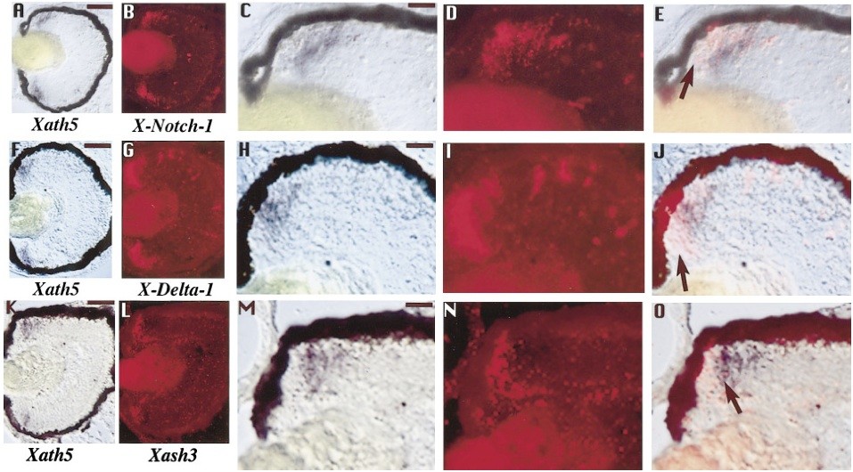 FIG. 3. Comparison of Xath5 expression pattern with that of neurogenic and achaete-scute-like genes in stage 40 Xenopus retina. (A) Comparison of X-Notch-1 and Xath5 expression patterns. Double in situ hybridizations were performed as in Fig. 1 with Xath5 in deep purple and X-Notch-1 in red. (A) Xath5 expression is detected in the CMZ except in cells in the most peripheral region. Occasional labeled cells were seen in the central retina, being probably late born cells. (B) X-Notch-1 labeling is also detected in the CMZ except in cells in the most peripheral region. Occasional labeled cells are seen in the central retina. C and D show a higher magnification of the CMZ from the sections depicted in A and B, respectively. (E) Double labeling demonstrates that X-Notch-1 and Xath5 expressions do not exactly overlap, since some X-Notch-1 positive cells do not express Xath5 (arrow). Scale bar in A and B, 100 um; scale bar in C, D, and E, 30um. (F) Comparison of X-Delta-1 and Xath5 expression patterns. Double in situ hybridizations were performed as in Fig. 1 with Xath5 in deep purple and X-Delta-1 in red. (F) Xath5 expression is detected in the CMZ except in cells in the most peripheral region. (G) X-Delta-1 labeling is also detected in the CMZ except in cells in the most peripheral region. H and I show a higher magnification of the CMZ from the sections depicted in F and G, respectively. (J) Double labeling demonstrates that X-Delta-1 and Xath5 expressions do not exactly overlap, since some X-Delta-1 positive cells do not express Xath5 (arrow). Scale bar in F and G, 100 um; scale bar in H, I, and J, 30 um. (K) Comparison of Xath5 and Xash3 expression patterns. Double in situ hybridizations were performed as in Fig. 1 with Xath5 in deep purple and Xash3 in red. (K) Xath5 expression was restricted to the more central part of the CMZ. (L) Xash3 labeling was also restricted to the more central part of the CMZ. M and N show a higher magnification of the CMZ from the sections depicted in K and L, respectively. (O) Double labeling demonstrates that Xash3 expression starts more in the periphery of the CMZ than Xath5 expression and that there is a small area in the CMZ where both expressions overlap (arrow). Scale bar in K and L, 100 um; scale bar in M, N, and O, 30 um. |