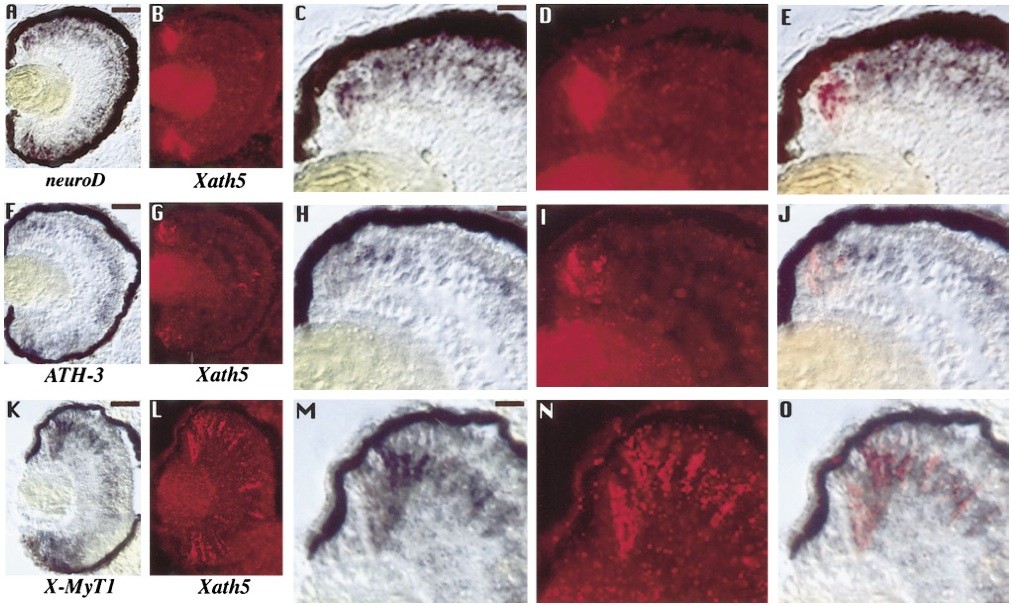 FIG. 4. Comparison of Xath5 and other proneural gene expression patterns in stage 40 Xenopus retina. (A) Comparison of Xath5 and neuroD expression patterns. Double in situ hybridizations were performed as in Fig. 1 with neuroD in deep purple and Xath5 in red. (A) neuroD expression is seen in cells in the CMZ and in the central retina, in the outer part of the inner nuclear layer, and in the outer nuclear layer. (B) Xath5 expression is detected in the CMZ except in cells in the most peripheral region. C and D show a higher magnification of the CMZ from the sections depicted in A and B, respectively. (E) Double labeling demonstrates that Xath5 and neuroD expressions start at the same level in the CMZ. Scale bar in A and B, 100 ï°m; scale bar in C, D, and E, 30 ï°m. (F) Comparison of ATH-3 and Xath5 expression patterns. Double in situ hybridizations were performed as in Fig. 1 with ATH-3 in deep purple and Xath5 in red. (F) ATH-3 expression is seen in cells in the CMZ and in the central retina, in the outer part of the inner nuclear layer. (G) Xath5 expression is detected in the CMZ except in cells in the most peripheral region. H and I show a higher magnification of the CMZ from the sections depicted in F and G, respectively. (J) Double labeling demonstrates that Xath5 and ATH-3 expressions start at the same level in the CMZ. Scale bar in F and G, 100 ï°m; scale bar in H, I, and J, 30 ï°m. (K) Comparison of X-MyT1 and Xath5 expression patterns. Double in situ hybridizations were performed as in Fig. 1 with this time X-MyT1 in deep purple and Xath5 in red. (K) X-MyT1 expression is seen in cells in the CMZ and in the central retina, in the inner nuclear layer. (L) Xath5 expression is detected in the CMZ except in cells in the most peripheral region. In the central retina, similarly to what was observed for X-Notch-1 and X-Delta-1, a few cells, probably late born cells, express Xath5 in this retina which is at a slightly younger stage than the retina shown in Fig. 3. M and N show a higher magnification of the CMZ from the sections depicted in K and L, respectively. (O) Double labeling demonstrates that Xath5 and X-MyT1 expressions start at the same level in the CMZ. Scale bar in K and L, 100 um; scale bar in M, N, and O, 30 um |