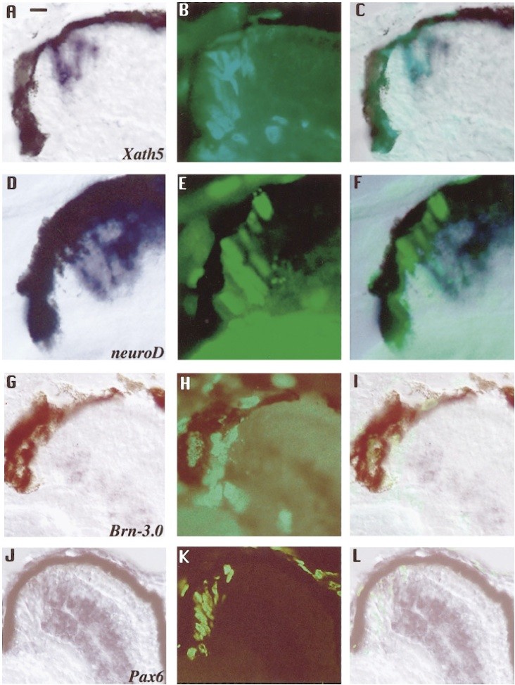 FIG. 7. Double staining for BrdU uptake and gene expression in stage 40 Xenopus CMZ. (A) Double staining for BrdU uptake and Xath5 expression. Xath5 staining is shown in A, BrdU immunostaining in B. Double staining in C shows that BrdUï° cells in the peripheral CMZ are Xath5ï°. In the central CMZ, BrdUï° cells are stained for Xath5. A few cells are BrdUï° and stained with Xath5. (D) Double staining for BrdU uptake and neuroD expression. neuroD staining is shown in D, BrdU immunostaining in E. Double staining in F shows that BrdUï° cells in the peripheral CMZ are neuroDï°. In the central CMZ, BrdUï° cells are stained for neuroD. neuroDï° cells in the central retina are BrdUï°. (G) Double staining for BrdU uptake and Brn-3.0 expression. Brn-3.0 staining is shown in G, BrdU immunostaining in H. Double staining in I shows that all BrdUï° cells in the CMZ are Brn-3.0ï° and that all Brn-3.0ï° cells are BrdUï°. (J) Double staining for BrdU uptake and Pax6 expression. Pax6 staining is shown in J, BrdU immunostaining in K. Double staining in L shows that BrdUï° cells in the CMZ express a low level of Pax6 and that cells in the central retina expressing a strong level of Pax6 are BrdUï°. Peripheral CMZ is on the left. Scalebar in A, 30 ï°m. |