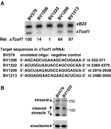 Down-regulation of xtreacle expression using antisense oligodeoxynucleotides. (A) X. laevis oocytes were microinjected with antisense oligodeoxynucleotides (32 ng per oocyte) and total RNA was isolated after 24 h. RT-PCR was used to determine the levels of expressions of mRNA for Xenopus nucleolar protein B23 (xB23) and Tcof1 (xTcof1) in the same reaction mix containing 50 ng total RNA. One oligo in each pair of primers was 32P-end labeled. The phosphorous image signals were analyzed using the ImageQuant software and the level of xTcof1 expression, after normalizing against xB23, was calculated relative to the negative control (see numbers below the image). The antisense target sequences in the xTcof1 mRNA are shown below the panel. BV579 is an unrelated oligo used as negative control. (B) Western blot analysis using anti-xtreacle antibody and protein extracts from oocytes incubated for 5 days after microinjection with BV579 control oligo or BV1222 xTcof1 antisense. The membrane was stripped and re-probed with anti-xnucleolin antibody to check protein loading. Numbers on the right refer to molecular weight markers in kDa.