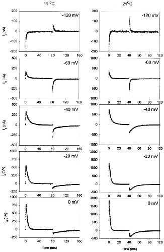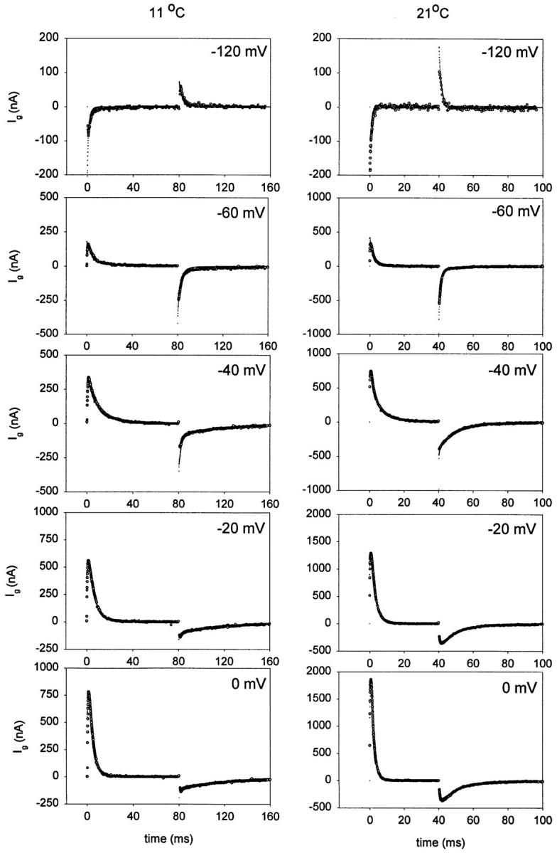 Figure 16. Data and model prediction. Family of gating current traces (○) obtained at two different temperatures (21 and 11°C) fitted with an 11-state sequential model (dots) with parameters shown in Table III. Unsubtracted gating currents elicited in response to variable test pulses from −120 to 0 mV. Holding potential was −90 mV. The test pulses were 40- and 80-ms long at 21 and 11°C, respectively. Data obtained at 21°C was filtered at 5 kHz and digitized every 50 μs. Data obtained at 11°C was filtered at 2.5 kHz and digitized every 80 μs. |