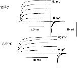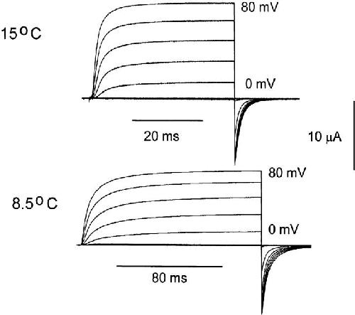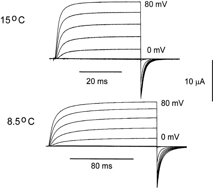 Figure 1. Macroscopic ionic currents from ShH4ir at 15.1°C and 8.5°C. Currents were elicited in response to test pulses from −80 to +80 mV in 10-mV increments from and returning to a holding potential of −90 mV. The test-pulse duration was 40 ms at 15.1°C and 180 ms at 8.5°C. Data obtained at 15.1°C was filtered at 5 kHz and digitized every 50 μs. Data obtained at 8.5°C was filtered at 1 kHz and digitized every 180 μs. Internal solution 120 K+-MES and external solution 60 K+-MES. A P/−4 subtraction protocol was used. |