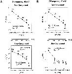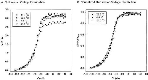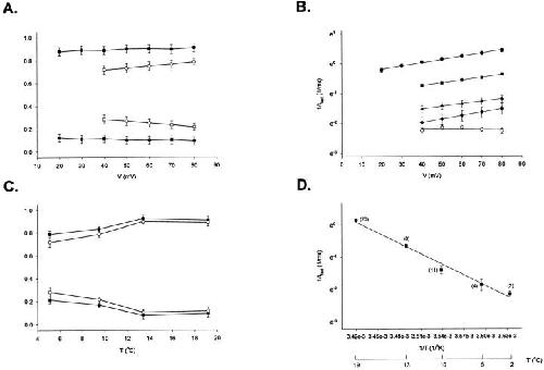 Figure 10. Arrhenius plots of the decaying kinetic components of the gating currents elicited as a response to a test pulse of −60 mV. The On and the Off responses of the experimental traces were fitted with a three- exponential function: a rising phase followed by two decaying components. (A) Arrhenius plots for the On response decaying kinetic components at −60 mV. (B) Arrhenius plot for the Off response decaying components. Energy of activation, Ea, obtained from the slope of the Arrhenius plot (slope = −Ea/R). |