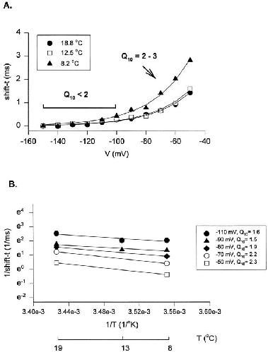 Figure 4. Temperature dependence of the Cole-Moore shift (shift-t). (A) Delay or time shift (shift-t, in milliseconds) due to the hyperpolarized prepulses at different temperatures. Lines show fit to a single exponential function of the voltage dependence of the Cole-Moore shift at each temperature tested. (B) Arrhenius plot of the Cole-Moore shift. 1/shift-t as a function of temperature at different voltages of prepulses. |