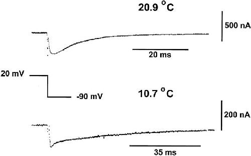 Figure 9. Time course of the Off response of gating current obtained at depolarized potentials at different temperatures. Unsubtracted Off responses traces elicited after a test pulse of 20 mV returning to −90 mV (holding potential). Traces obtained at 20.9 and 10.7°C. Gating current trace obtained at 20.9°C was originally filtered at 5 kHz and digitized every 50 μs. Trace shown in the figure was digitally filtered to 2 kHz. Gating current trace obtained at 10.7°C was filtered at 2 kHz and digitized every 80 μs. Notice that at low temperature the rising phase is lost and a faster decaying component appears. |