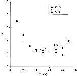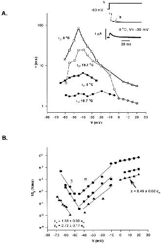 Figure 12. Time constants (τ) of the decaying components of the On response of gating currents as a function of voltage (V). (A) Voltage and temperature dependence for each kinetic component for three different experiments. Open symbols represent the slow decaying component: ○ at 19.7°C, □ at 8°C. Closed symbols represent the fast decaying component: • at 19.7°C, ▪ at 8°C. Gray symbols indicate the voltage region where the On response was fitted with one exponential function. (B) Time constant of the slow decaying component (1/τ2, 1/ms) as a function of voltage (V). Determination of the valence times the fraction of the electric field (z). Data obtained from the same experiment shown in A at three different temperatures: 19.2°C, •; 8°C, ▪; 4.5°C, ▴. Lines represent the linear regression used to estimate z from the slope of each curve (slope = z.F/ RT) at each voltage region. Notice the change in the slope for the data obtained at depolarized potentials (>−10 mV), corresponding to z = 0.45 ± 0.02 eo (n = 3). Between −65 and −45 mV, backward rates predominate, z = 2.72 ± 0.17 eo (n = 3). Between −45 and −10 mV, forward rates predominate: z = 1.63 ± 0.09 eo (n = 3). |