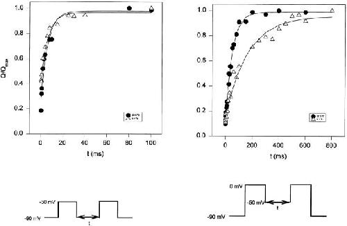 Figure 13. Reactivation of gating currents after a variable recovery interval showing the kinetic behavior for each component of the total charge movement. Normalized charge movement (Q/Qmax) as a function of the duration of the test-pulse (t, ms) at two different temperatures (20.5 and 9.1°C). Data obtained from the integration of the On response of the gating currents elicited using the double-pulse protocol (Oxford, 1981), between −90 and −50 mV (left), and between −50 and 0 mV (right). |