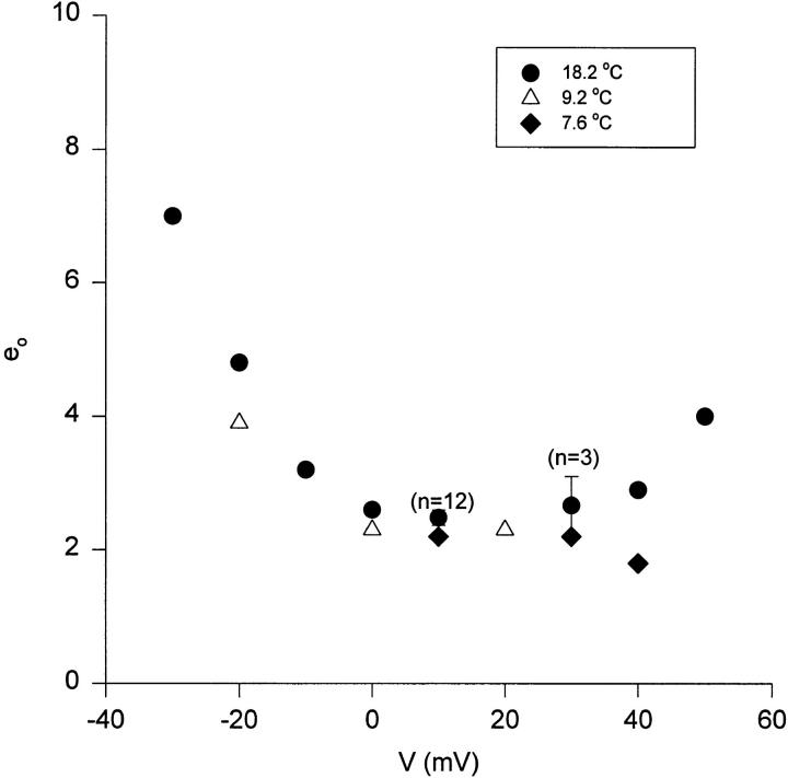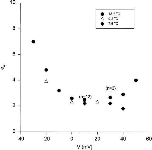Figure 15. Elementary gating charge movement. Temperature and voltage dependence. Measurement of the elementary charge movement (eo) estimates the value of the predominant charge transfer in the activation pathway. Gating current ensembles consisting of >100 traces at each voltage in the saturated region of the Q-V were obtained with the macropatch technique. The experiment was performed at three temperatures (18.2°C, •; 9.2°C, ▵; and 7.6°C, ♦). |