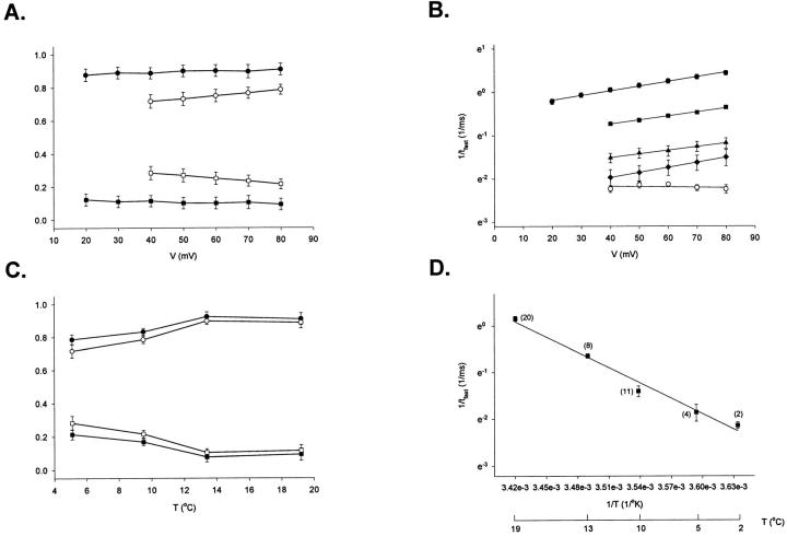 Figure 2. Kinetics of ionic current activation in response to depolarized potentials (>20 mV). Ionic currents were fit to a sum of two exponential functions: I(t) = a + bexp(−t/τ1) + c exp(−t/τ2), where I(t) is the macroscopic ionic current as a function of time, t. The ionic current trace was fitted after the initial delay. (A) Proportion of kinetic components of ionic currents obtained at depolarized potentials as a function of voltage at two different temperatures 19.2°C (•, ▪) and 5.1°C (○, □). (B) Reciprocal of the time constant of the fast kinetic component (1/τfast) as a function of voltage (V). Estimation of the valence times the fraction of electric field (z) from the slope = zF/RT. The value of z obtained at each temperature tested (between 19.2 and 5.1°C) is between 0.2 and 0.28 eo. (C) Proportion of kinetic components of ionic currents obtained at depolarized potentials as a function of temperature from ionic currents obtained at two different test pulses: 40 mV (○, □) and 80 mV (•, ▪). (D) Arrhenius plot for the fast kinetic component from ionic currents elicited by a test pulse to 50 mV. The energy of activation (Ea) obtained from the slope = −Ea/R. Results shown in A–D as the mean ± SEM from several experiments. |
