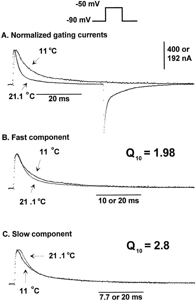 Figure 8. Kinetic behavior for the On response of gating currents obtained at −50 mV. Unsubtracted traces elicited in responses to a test pulse of −50 mV at 21.1 and 11°C. The holding potential was −90 mV. The test pulses were 40- and 80-ms long at 21.1 and 11°C, respectively. Postpulses were 160-ms long. Data obtained at 21.1°C was originally filtered at 5 kHz and digitized every 50 μs. The trace shown in the figure was digitally filtered at 2 kHz to compare with data obtained at 11°C. Data obtained at 11°C was filtered at 2 kHz and digitized every 80 μs. (A) Normalized gating currents. Traces obtained at 21.1 and 11°C normalized for the size of the peak of the On response of the gating current (multiplying by 2.08) and superimposed. (B) Fast component. Gating current trace obtained at 21.1°C multiplied by a time-expansion factor (2×) to superimpose with the first part of the gating current trace obtained at 11°C. (C) Slow component. Gating current trace obtained at 21.1°C multiplied by a time-expansion factor (2.6×) to superimpose with the second part of the gating current trace obtained at 11°C. 0 K+/0 Na+ internal and external solutions. |