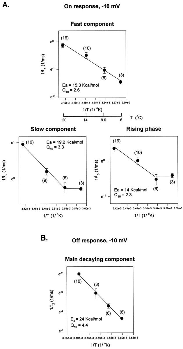 Figure 11. Arrhenius plots of kinetic components describing the gating currents elicited as a response to a test pulse of −10 mV. (A) Arrhenius plots for the On response kinetic components: fast component, slow component, and rising phase. (B) Arrhenius plot for the main decaying component of the Off response. The Arrhenius plot for the time constant of the faster decaying component that appears at low temperatures was not included (see Fig. 9). |