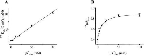 Figure 2. Summary of extracellular K+ dependence of ROMK1 channel blockade by internal TEA. (A) TEAK (0 mV) was plotted against [K+]ext. The line corresponds to the least-squares fit of a linear equation. (B) TEA(zδ)obs (mean ± SEM, n = 5) was plotted against [K+]ext. The curve corresponds to the least-squares fit by the equation TEA(zδ)obs = {TEA(zδ)inf − TEA(zδ)0 [K+]ext}/([K+]ext + KK app) + TEA(zδ)0, where KK app is the apparent (empirical) dissociation constant for the binding of external K+ to the pore, while TEA(zδ)0 and TEA(zδ)inf are TEA(zδ)obs when concentrations of external K+ ([K+]ext) are zero and infinity, respectively. The fit gives that TEA(zδ)0 = 0.39, TEA(zδ)inf = 0.92, and KK app = 9.6 mM. The data points corresponding to 0 mM external K+ were obtained in a nominal K+ free solution.