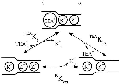 Figure 7. A model for TEA binding to a pore with three K+ sites. The model, modified from the model in Fig. 6 B, has two K+ sites in the narrow region of the pore and a third site in a wider internal region where either K+ or TEA can bind.