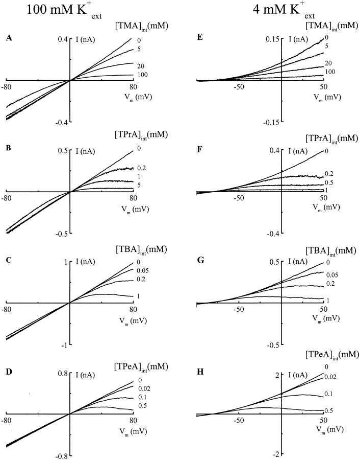Figure 3. Voltage and extracellular K+ dependence of ROMK1 channel blockade by TEA derivatives. (A–H) Macroscopic I-V curves recorded in various concentrations of quaternary ammoniums with either 100 mM external K+ (left) or 4 mM external K+ (right). TMA, TPrA, TBA, and TPeA stand for tetramethylammonium, tetrapropylammonium, tetrabutylammonium and tetrapentylammonium, respectively. [K+]int was 100 mM and [K+]ext was as indicated.