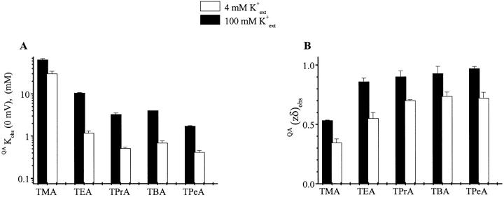 Figure 4. Summary of extracellular K+ dependence of ROMK1 channel blockade by TEA and its derivatives. QAK obs (0 mV) and QA(zδ)obs (mean ± SEM, n = 5) values obtained as described in Fig. 1.