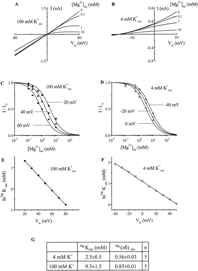 Figure 5. Voltage and extracellular K+ dependence of ROMK1 channel blockade by internal Mg2+. (A and B) Macroscopic I-V curves of ROMK1 channels recorded in various [Mg2+]int. [K+]int was 100 mM and [K+]ext was as indicated in the figure. (C and D) Fractions of unblocked currents (I/Io) obtained from A and B were plotted against [Mg2+]int for several membrane voltages. Curves superimposed on the data correspond to least-squares fits using I/I0 = MgK obs/ (MgK obs + [Mg2+]int). (E and F) ln MgKobs obtained from C and D were plotted against membrane voltage (Vm). The lines superimposed on the data correspond to least-squares fits using the Woodhull equation, ln MgK obs = ln MgK obs (0 mV) − Mg(zδ)obsF Vm/ RT. (G) MgK (0 mV)obs and Mg(zδ)obs (mean ± SEM, n = 5) for both [K+]ext.