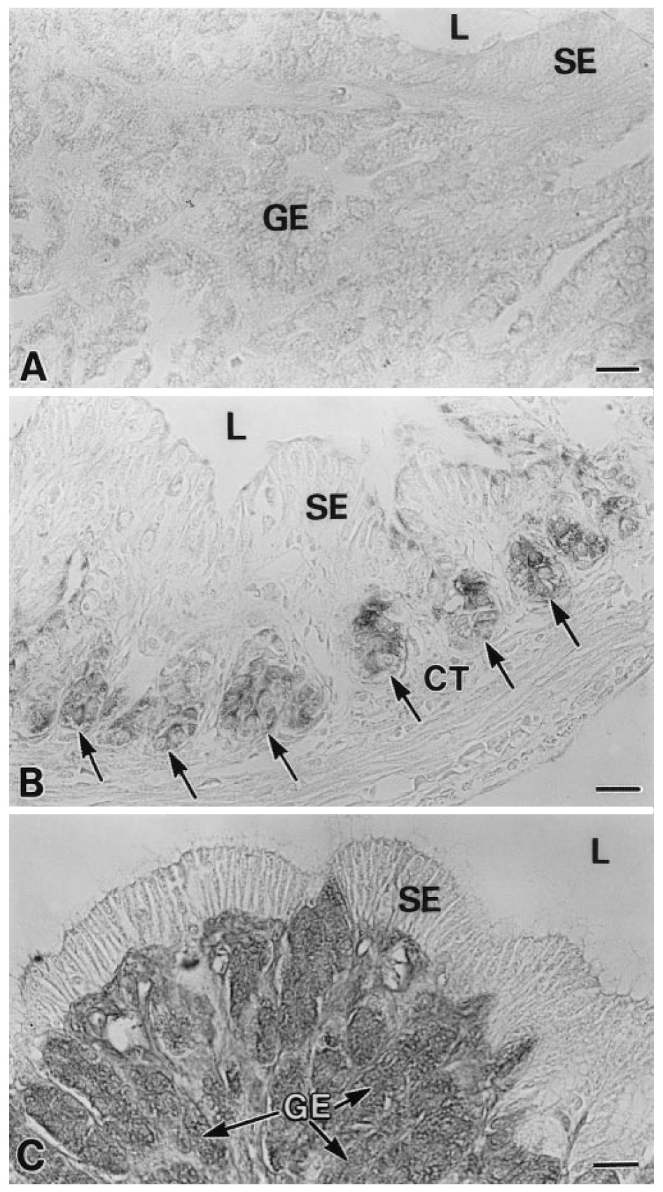 are detected only in developing adult glands (arrows). CT Connective