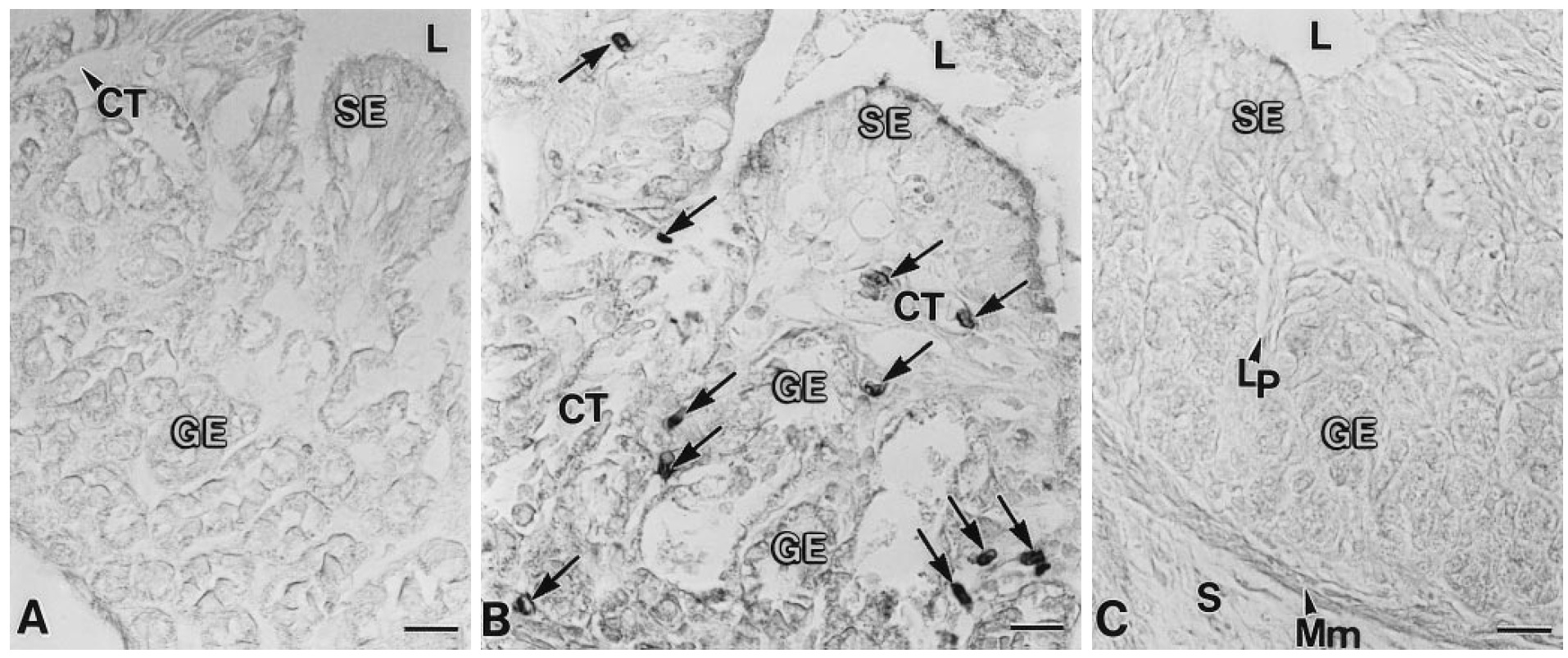 Fig. 3AâC Immunohistochemical detection of Pg in the stomach.