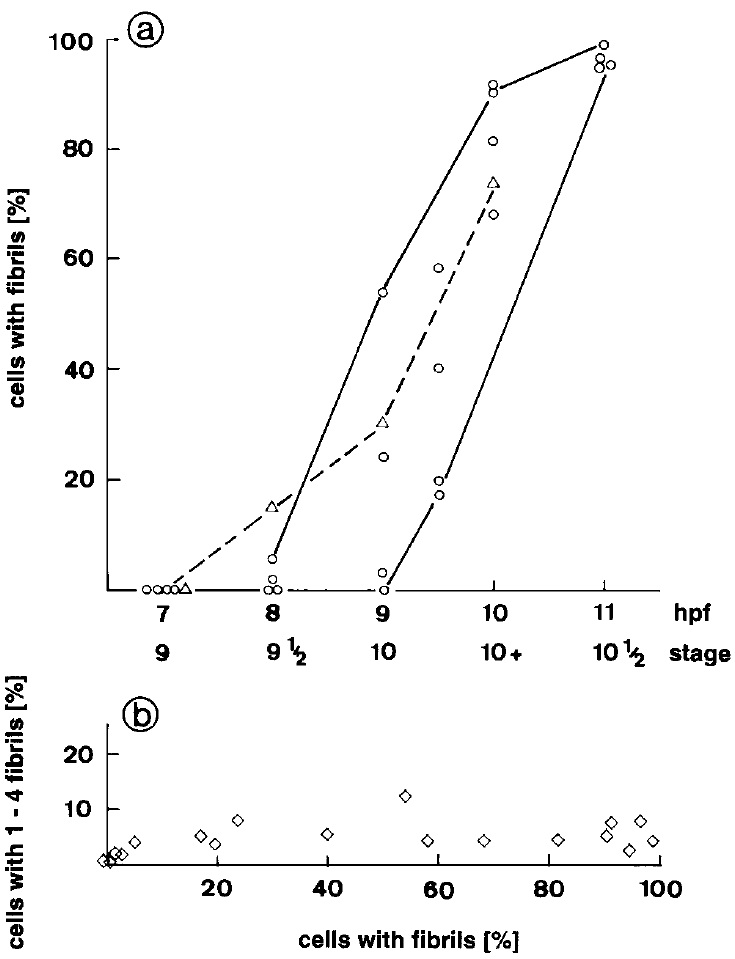 (1988). b: Percentage of cells initiating fibril formation, as a function of the