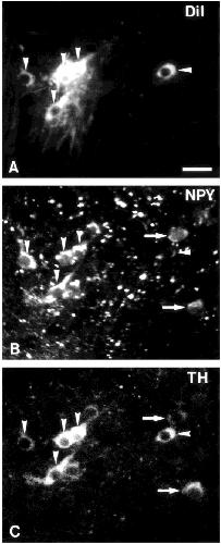 neurons are triple-labelled for Fast DiI, NPY, and TH (arrowheads),