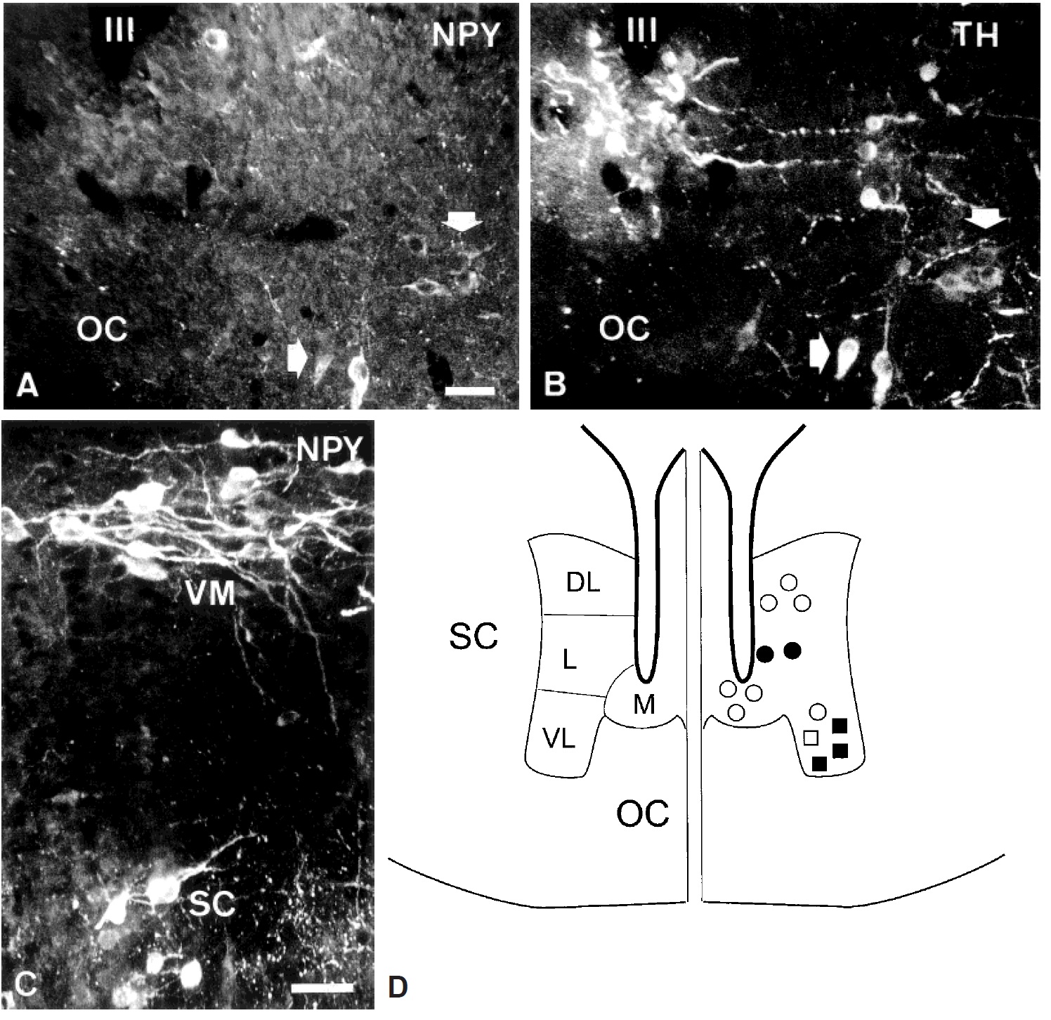nucleus (SC). D: Diagram showing the locations of NPYimmunoreactive