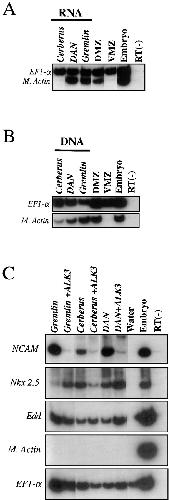 (C) DAN-family members have similar activities in animal cap explants. Unless noted, 100 pg of Gremlin, Cerberus, or DAN with or without 1 ng of the constitutively activated type I BMP receptor ALK3(Q233D) was injected into the animal poles of one-cell embryos. For analysis of NCAM induction only, 1 ng of Cerberus or 10 ng of DAN was injected. RTâPCR analysis of explants shows that all three family members induce NCAM. The degree of induction between different family members cannot be directly compared because these data are from independent experiments. The lack of M. actin shows that neural induction occurs without a mesodermal intermediary. For all three family members, neural induction is blocked by constitutively activated ALK3(Q233D), suggesting that they induce neural tissue by antagonizing BMP signaling. In addition, all three DAN-family members induce the cardiac marker Nkx 2.5 and the endodermal marker Edd. This induction is unaffected by constitutive activation of the BMP signaling pathway. |