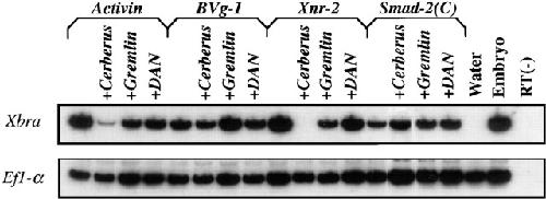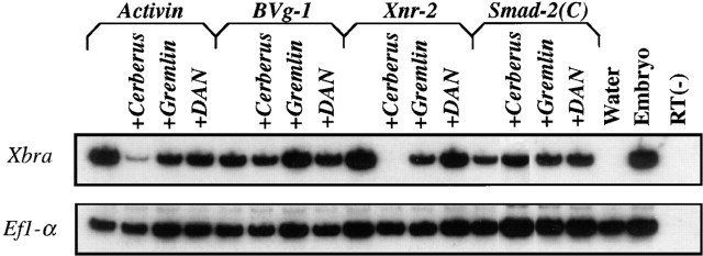 Animal cap assays on explants isolated from embryos expressing Activin (1 pg), BVg1 (100 pg), Xnr2 (100 pg), or Smad2(C) (100 pg) mRNA with or without 1 ng of Cerberus, Gremlin, or DAN mRNA. Animal caps were harvested at stage 10.5–11, and expression of the mesodermal marker Xbra and the loading control Ef1α assessed by RT–PCR. Coexpression with Cerberus specifically blocks the mesoderm-inducing activities of Activin and Xnr2, but not BVg1 or Smad-2(C). Gremlin and DAN do not block mesoderm induction by any activities tested. |