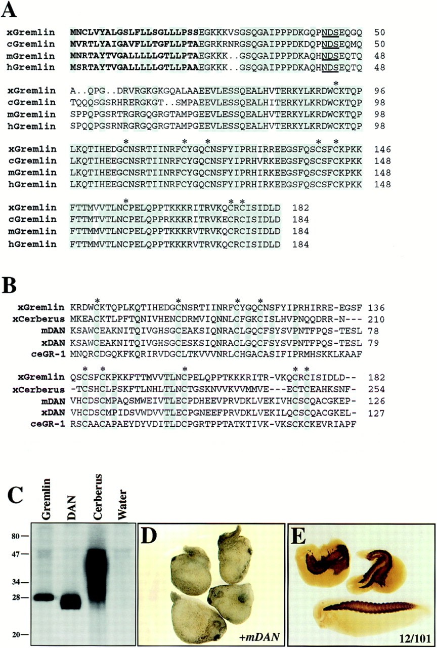 (B) Sequence alignment of the cysteine-rich domain shared by Gremlin, Cerberus, mouse DAN (mDAN), Xenopus DAN (xDAN), and C. elegans Gremlin-related-1 (ceGR-1). Conserved cysteines are marked with asterisks and shaded. Other conserved residues are shaded.