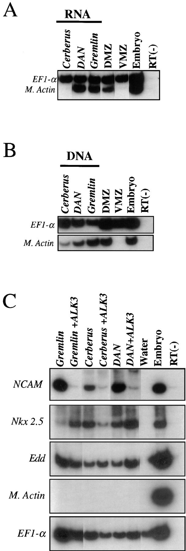 (B) When expression is directed to blastula stages by injecting each family member as a DNA construct, Cerberus, Gremlin, and DAN all induce M. actin.