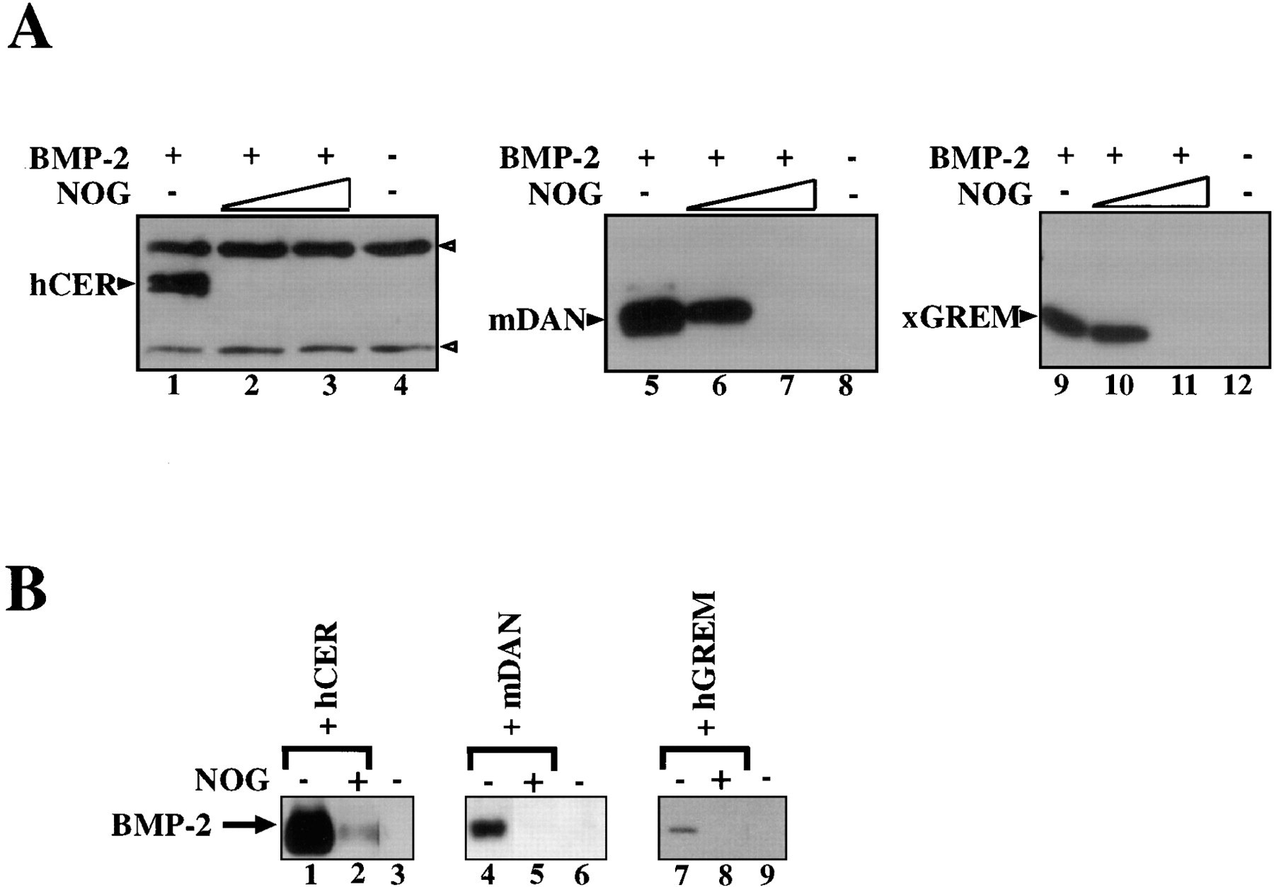 (A) Coimmunoprecipitation of DAN-family members with BMP2. COS-cell supernatants containing human Cerberus (hCer), mouse DAN (mDAN), or Xenopus Gremlin (xGrem) were incubated with anti-BMP2,4 protein G beads in the presence or absence of 1 μg of BMP2. Beads were processed and analyzed by Western blot for the presence of coprecipitating hCer, mDAN, or xGrem. Each DAN-family member precipitates in a BMP2-dependent fashion (lanes 1 and 4, 5 and 8, 9 and 12). Addition of 2 μg of Noggin eliminates hCer binding (lane 2), but not binding of mDAN (lane 6) or xGrem (lane 10). Addition of 10 μg of Noggin prevents all three family members from binding BMP2 (lanes 3, 7, and 11). Open arrowheads indicate immunoglobulin heavy and light chains.