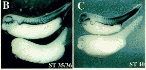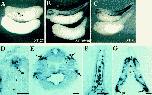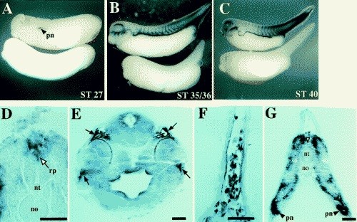 Figure 2. Gremlin Is Expressed in the Neural Crest(A) Stage 27 embryo showing Gremlin expression in the nascent pronephric duct ([pn], arrowhead), midtrunk neural crest, and tailbud.(B) At stage 35/36, Gremlin expression expands rostrocaudally to include neural crest cells in the head, the trunk, and the fin.(C) Stage 40 embryo showing Gremlin expression following fin elongation. For (A) (C), an embryo probed with a sense control is on the bottom of each panel.(D) Section through the posterior trunk of a stage 30 embryo shows Gremlin expression in the roofplate of the neural tube and the overlying epithelium (open arrow).(E) Section through the head of a stage 38 embryo showing Gremlin expression in the mandibular mesenchymal neural crest surrounding the eye (arrow).(F) Fin section through a stage 38 embryo showing expression in mesenchymal cells.(G) Midtrunk section through a stage 38 embryo. Gremlin expression reveals the ventral migration pathways of trunk neural crest cells as they pass medially and laterally to the somite ([45, 31 and 10]). The subepithelial migration accounts for the chevron-shaped stripes of staining seen in whole mounts; Nomarski analysis of whole mounts in conjunction with horizontal sections shows that these cells migrate in the immediate vicinity of the boundaries between individual somites. Open arrowhead indicates the birthplace of neural crest cells. Closed arrowheads indicate staining of cells lining the pronephros. (rp) = roofplate, (nt) = neural tube, (no) = notochord, (so) = somite. Scale BAR= 50 um. |