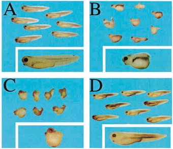 Fig. 6. Xcad-2 can rescue LiCl-dorsalized embryos. Groups of embryos treated with LiCl and injected ventrally with Xcad-2 sense RNA (D) are rescued to resemble the normal control embryos (A) and not LiCl-treated embryos (B) or embryos treated with LiCl and injected with LacZ mRNA (C). A panel with an enlarged embryo is shown for each treatment.