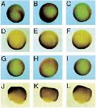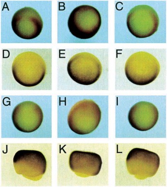 Fig. 1. Regulation of ventral genes by Xcad-2. Embryos injected with Xcad-2 mRNA (B,E,H,K) or antisense Xcad-2 RNA (C,F,I,L) or control embryos (A,D,G,J) were analyzed by in situ hybridization with probes specific for the Xpo (AâC), Xvent-1 (DâF), Xvent-2/Vox (GâI) and BMP-4 (JâL) genes. (AâI) Vegetal views. (JâL) Lateral views.