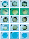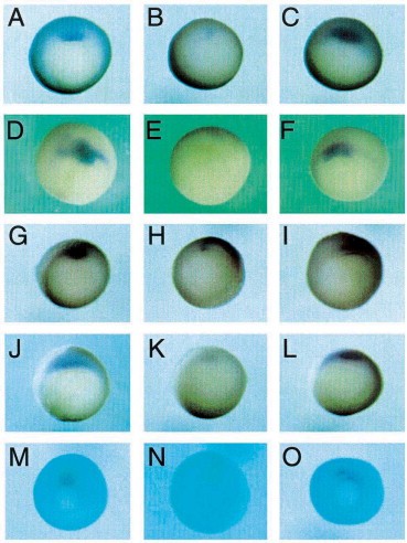 Fig. 3. Xcad-2 represses dorsal-specific genes. Embryos injected with sense (B,E,H,K,N) or antisense (C,F,I,L,O) RNA were probed for the expression of gsc (AâC), Xnot-2 (DâF), Otx-2 (GâI), Xlim-1 (JâL) and XFKH1 (MâO) during gastrula stages. Control embryos are also shown (A,D,G,J,M). All panels are vegetal views.
