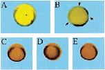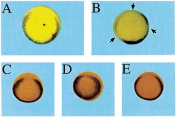 Fig. 4. Regulation of Xcad-2 by dorsal- and ventral-specific genes. Embryos injected diagonally with Xnot-2-capped RNA (B), or radially with BMP-4 mRNA (D) or BMP-4 antisense RNA (E) and probed for Xcad-2 expression are shown. Control embryos are also shown (A,C). The arrows mark the position of the gaps in the Xcad-2 ring of expression