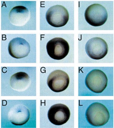 Fig. 5. Xcad-2 can function ventrally in the absence of BMP signaling. Control embryos (A,E,I) or embryos injected with either Xcad-2 mRNA (B,F,J), dominant negative BMP receptor sense RNA (C,G,K) or a combination of both Xcad-2 and dominant negative BMP receptor mRNAs (D,H,L) were probed with the gsc (AâD), Xpo (EâH) or Xvent-1 (IâL) probes.